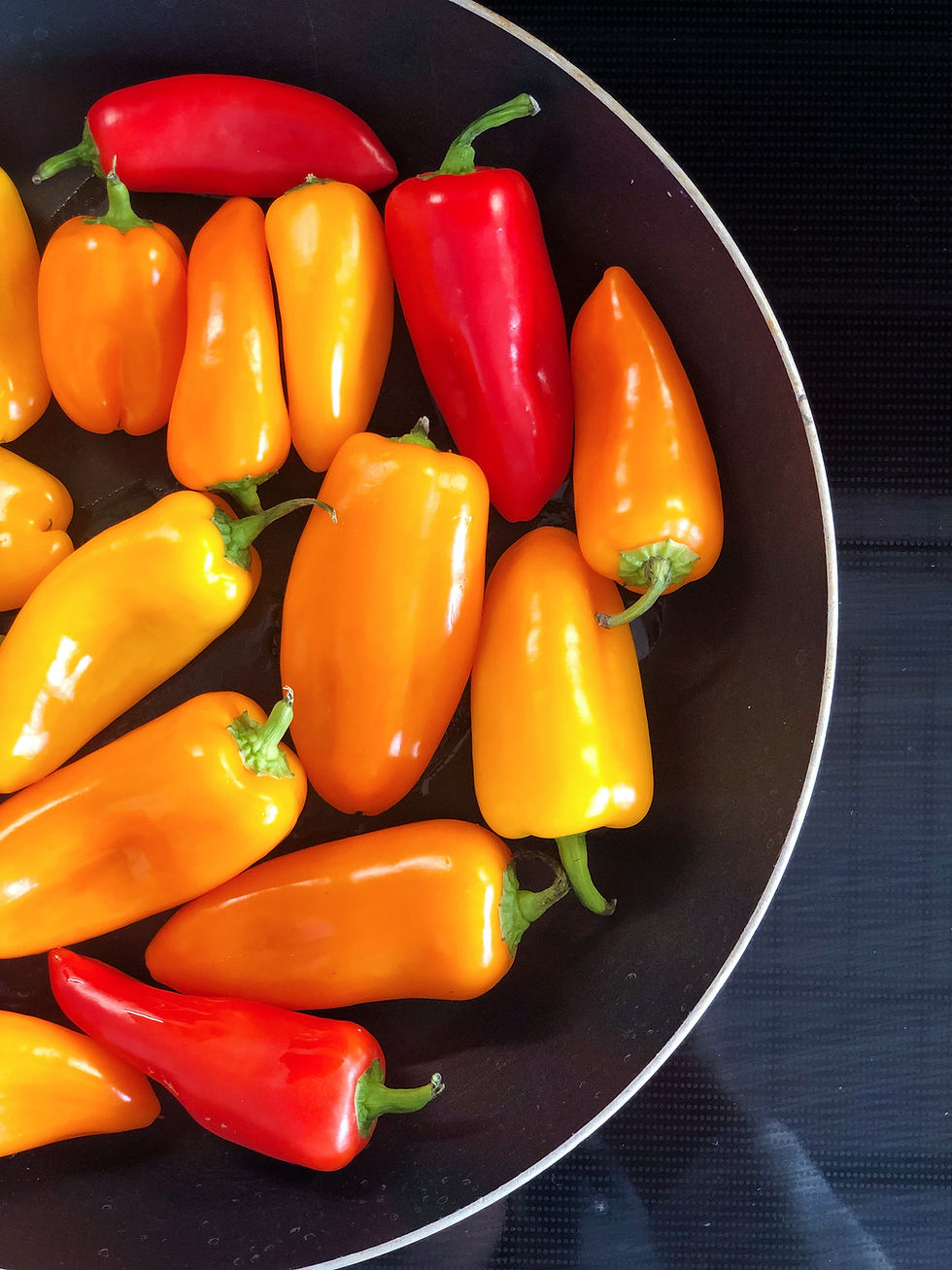 Directions 1. Sauté or grill mini peppers for 3-4 minutes per side, until peppers are moderately soft and have some color on each side. Set aside and allow to cool! 2. Combine salt, sugar, chili flake, vinegar and water and stir until salt and sugar are completely dissolved into the liquid.