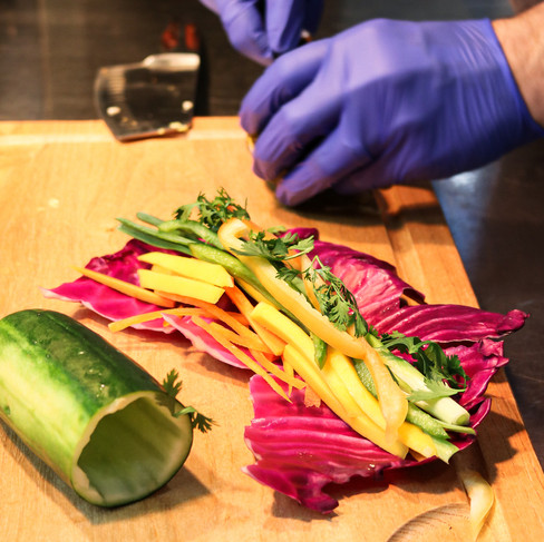 First take the cucumber and use a small paring knife to hollow out the seeds getting as much of them out as you possibly can. Peel back the red cabbage leaves and keep whole, you will be using this leaf to roll your garnish ingredients for the inside of the cucumber roll.